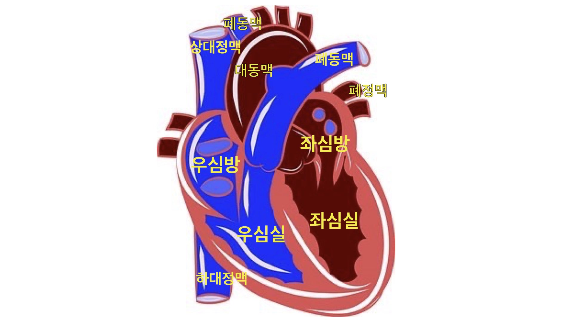 심장은 새빨간 주먹만한 덩어리의 장기입니다. 언뜻보면 하나의 빨간 근육 덩어리같지만 심장의 모양을 자세히 살펴보면 심장은 기능적으로 4개의 방으로 나뉘어져 있습니다. 사분면으로 나눠서 살펴보면 우심방, 우심실, 좌심방, 좌심실로 구성되어 있고 심장에 붙은 혈관들이 있습니다.